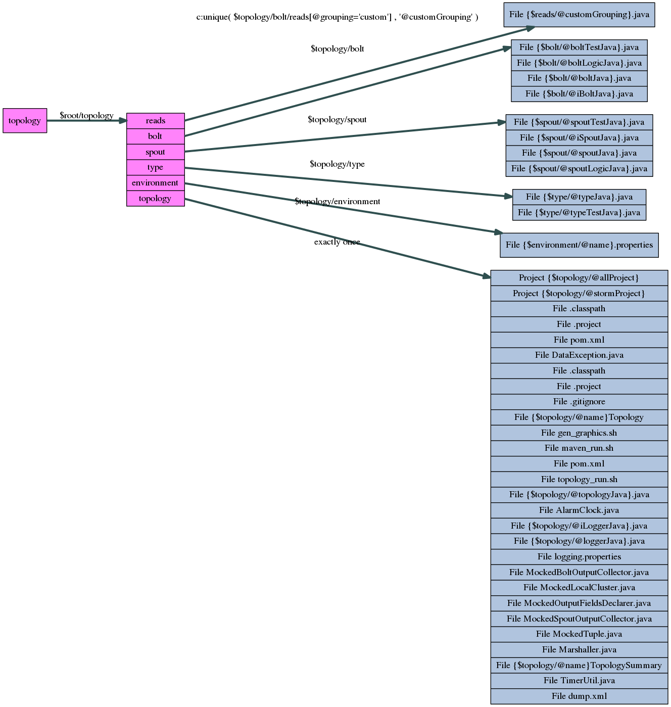 The Storm Topology gramar generates almost the entire implementation of a Storm topology with the following design patterns and features: